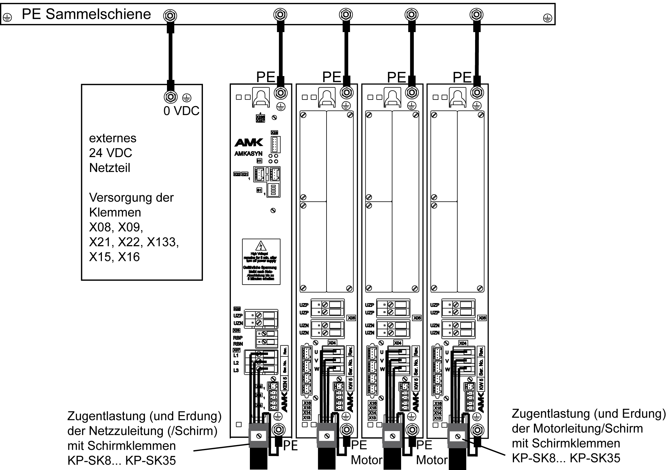 Alle AMKASYN-Gehäuse sind separat und auf kürzestem Weg mit Erde zu verbinden (zentrale PE-Sammelschiene Schaltschrank). Innerhalb der Gesamtanlage ist die Erdung sternförmig vom zentralen Erdungspunkt aus durchzuführen.