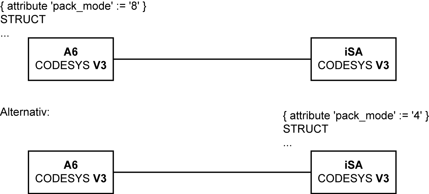Zur Anpassung der unterschiedlichen Speicherausrichtung von Variablen in verschiedenen Steuerungen kann in CODESYS V3 das Alignement einer Datenstruktur mittels {attribute 'pack_mode' := '<Value>'} explizit definiert werden (siehe: CODESYS Hilfe 'Attribut pack_mode').