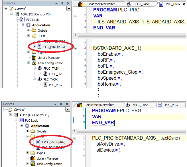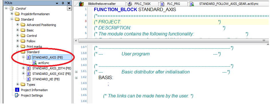 The AFL Standard blocks are called in the CODESYS program block 'PLC_PRG'. Axis blocks also has a synchronous action (act Sync). The synchronous action must be called in 'FPLC_PRG'.