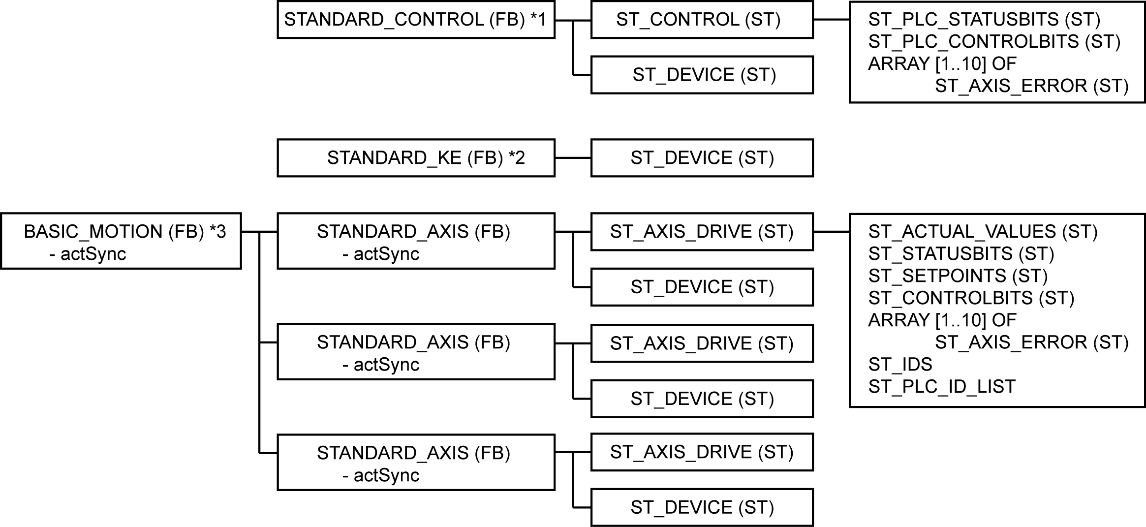 The FB 'BASIC_MOTION' is integrated into each standard axis block. That means FB 'BASIC_MOTION' must not be called separately in the PLC program. The interface between the device and AFL Standard block is realized with the Variable 'ST_DEVICE'. 'SET_CONTROL' summarizes the control-specific and 'ST_AXIS_DRIVE' the axis-specific data together.