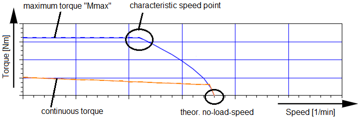 After the 'characteristic speed point' the maximum motor torque decreases with increasing speed. When the motor reach the theoretical no-load-speed, the motor torque is 0 Nm.
